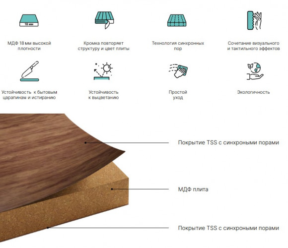 Коллекции FOREST выполнена из технологичных и прочных материалов: в основе – МДФ высокой плотности толщиной 18 мм. Класс эмиссии Е1. Фасады изготовлены по технологии TSS (термоструктурированные поверхности), которая включает в себя нанесение термореактивной смолы на декоративный слой плиты. Фасад становится невероятно прочным и устойчивым к механическим повреждениям. Фактура поверхности с высокой достоверностью имитирует благородные древесные, а также каменные и индустриальные текстуры. Такого эффекта удается достичь с помощью технологии синхронных пор. Она создаёт тактильный и визуальный эффекты текстурной поверхности и придает вашей мебели природную реалистичность. Обратная сторона фасадов идентична лицевой, кромка повторяет тиснение плиты. Материал устойчив к впитыванию пыли и грязи – его достаточно протереть влажной салфеткой. Фасады FOREST имеют высокую устойчивость к бытовым царапинам, истиранию и выцветанию декора.