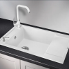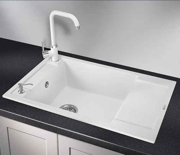Мойка с оригинальным дизайнерским решением: площадка для смесителя/дозатора расположена сбоку, что позволяет расширить функции и эргономику модели.