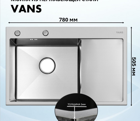 Мойка VANS левая L (780*505*200мм ) SATIN + ДОЗАТОР