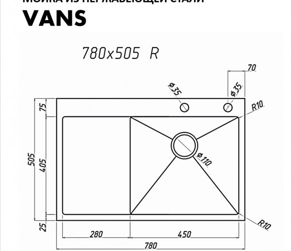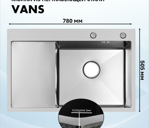 Мойка VANS правая R (780*505*200мм ) SATIN + ДОЗАТОР