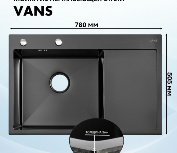 Мойка VANS левая L (780*505*200мм ) BLACK + ДОЗАТОР