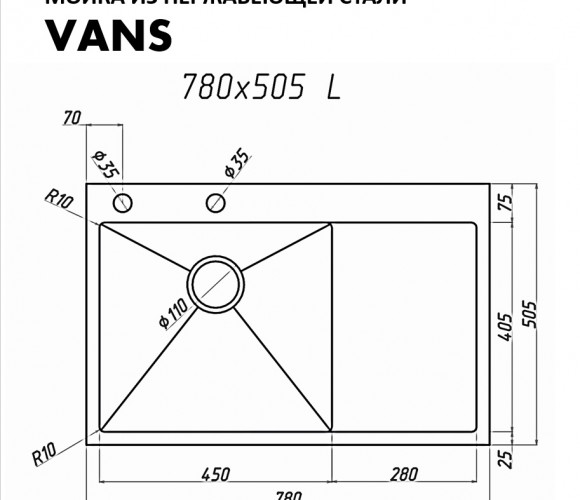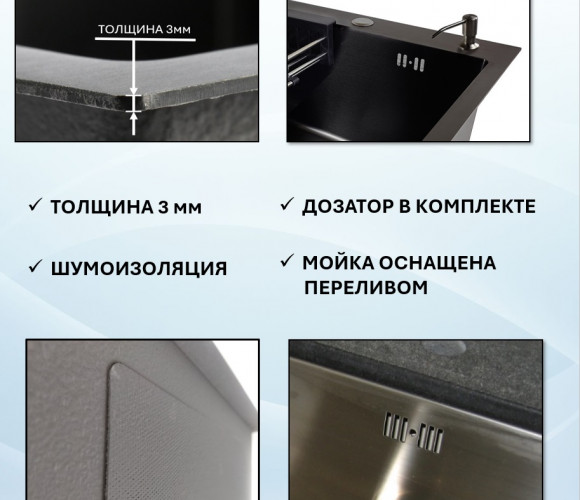 Мойка VANS правая R (780*505*200мм ) BLACK + ДОЗАТОР