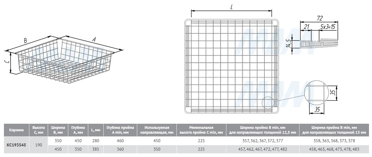 Корзина выкатная сетчатая BASE 190х350х450мм. черный КС193545ЧР