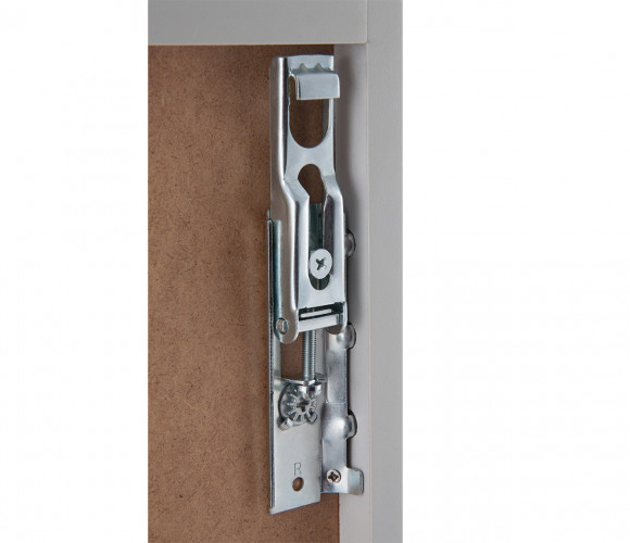 Невидимый навес STELS СН11 для верхних баз мебели, выдерживающий нагрузки на пару до 135 кг. Модель располагается на смещённой внутрь задней стенке мебельного корпуса, врезается в отверстия в боковинах и крепится с помощью ответной планки CHH01, которая приобретается отдельно. Положение навесов легко отрегулировать по вертикали +/- 9 мм и по горизонтали от плоскости стены + 11 мм через два заранее подготовленных отверстия в задней стенке короба. Для эстетики отверстия закрываются круглыми шляпками нейтрального белого цвета.