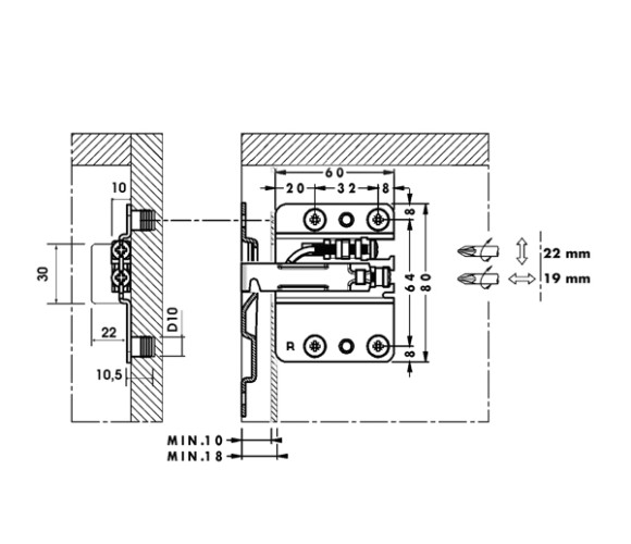 Подвеска каркаса MF применяется для нижних шкафов весом до 120 килограмм. Этот мебельный навес открывает творческий простор для дизайнеров интерьера. Мебель висящая на таких подвесах не требует декоративных опор, и как бы парит в воздухе. Подвески каркаса 807 абсолютно безопасны в использовании и имеют запатентованную защиту от случайного падения шкафа. Демонтаж шкафа производится при помощи отвертки, которую надо упереть в защитную пружину, находящуюся в крепежной пластине.