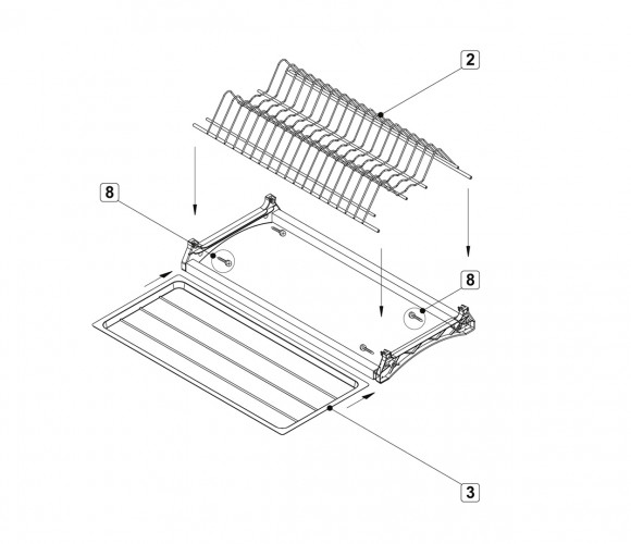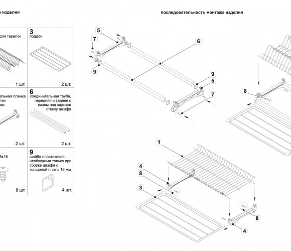 Комплект сушки включает 2 яруса для хранения посуды с надёжным гальваническим покрытием с эффектом хромирования, 2 съёмных поддона из качественного бесцветного пластика, 4 пластиковых серых держателя нижнего и верхнего уровней, переднюю и заднюю алюминиевые трубки, саморезы для монтажа сушки и крепления трубки.