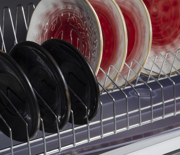 Особая форма прутков нижнего уровня позволяет по-настоящему удобно расположить в пространстве сушки большое количество посуды любого диаметра – от крошечных кофейных блюдец до габаритных сервировочных тарелок. При этом необязательно размещать посуду по центру, удобно ставить её и в дальние, и в ближние сектора сушки.