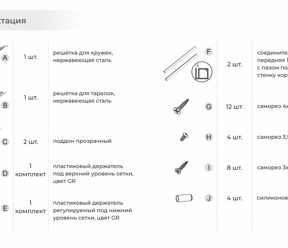 В комплект входит: решётка для кружек, решётка для тарелок, 2 съёмных пластиковых поддона нейтрального оттенка, 2 комплекта пластиковых держателей нижнего и верхнего уровня, 2 соединительных трубки, саморезы M4x20 – 12 штук, саморезы 3,5х8 – 4 штуки, саморезы 3х16 – 8 штук, силиконовые футорки – 4 штуки.