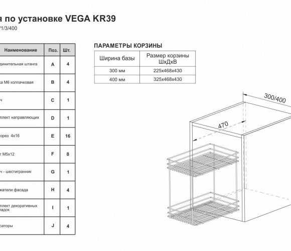 VEGA KR39 — складная корзина-карго в круглом прутке для удобного хранения ёмкостей различной высоты в модулях шириной 300 и 400 мм.