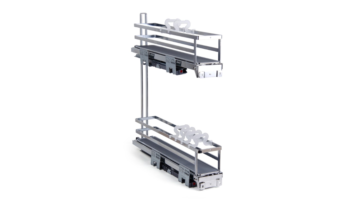 Модель обладает удобной регулировкой фасада в трёх плоскостях, стильным европейским внешним видом, плоской формой боковых прутков корзин. Сплошное дно с антискользящим покрытием и дополнительные съёмные делители FLORA гарантируют максимальную устойчивость хранимой утвари на обоих этажах. Кроме того, дно можно легко снять для чистки и мытья.