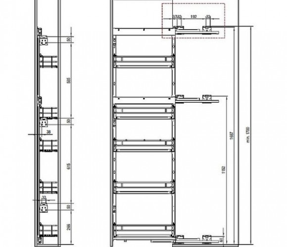 Выкатной пенал (или выдвижная колонна) – один из самых удобных, вместительных и функциональных кухонных механизмов. Выкатной пенал поможет организовать хранение предметов и сэкономить пространство на кухне. Модель оснащена направляющими полного выдвижения, а крепления расположены сверху и снизу. В результате, пенал выдвигается целиком, обеспечивая полный доступ к полкам с любой стороны – содержимое корзин легко рассмотреть и просто достать. Регулировка по высоте пенала до 30см, полки регулируются по высоте.