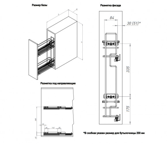 Cargo mini 200мм Квадро 2 + направл. Хеттих, бок.крепл. ПРАВАЯ, с крепл. к фасаду
