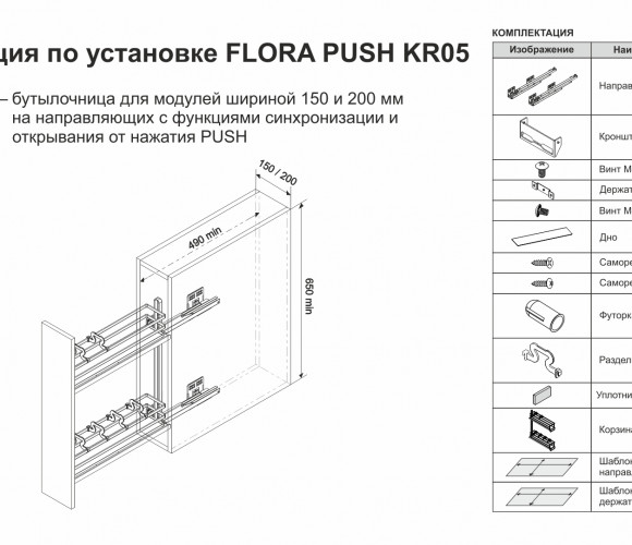 FLORA PUSH — это современная комфортная бутылочница с механизмом открывания от нажатия, предназначена для удобного хранения ёмкостей различной высоты в модулях шириной 150 или 200 мм.