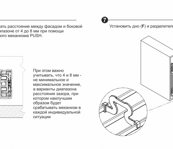Специальный красный регулировочный винт в конструкции направляющих и риски на корпусе механизма позволят отрегулировать расстояние между фасадом и боковой стенкой мебельного короба в диапазоне от 4 до 8 мм, тем самым отрегулировать срабатывание механизма под конкретное мебельное изделие и выстроить все фасады в единую линию.