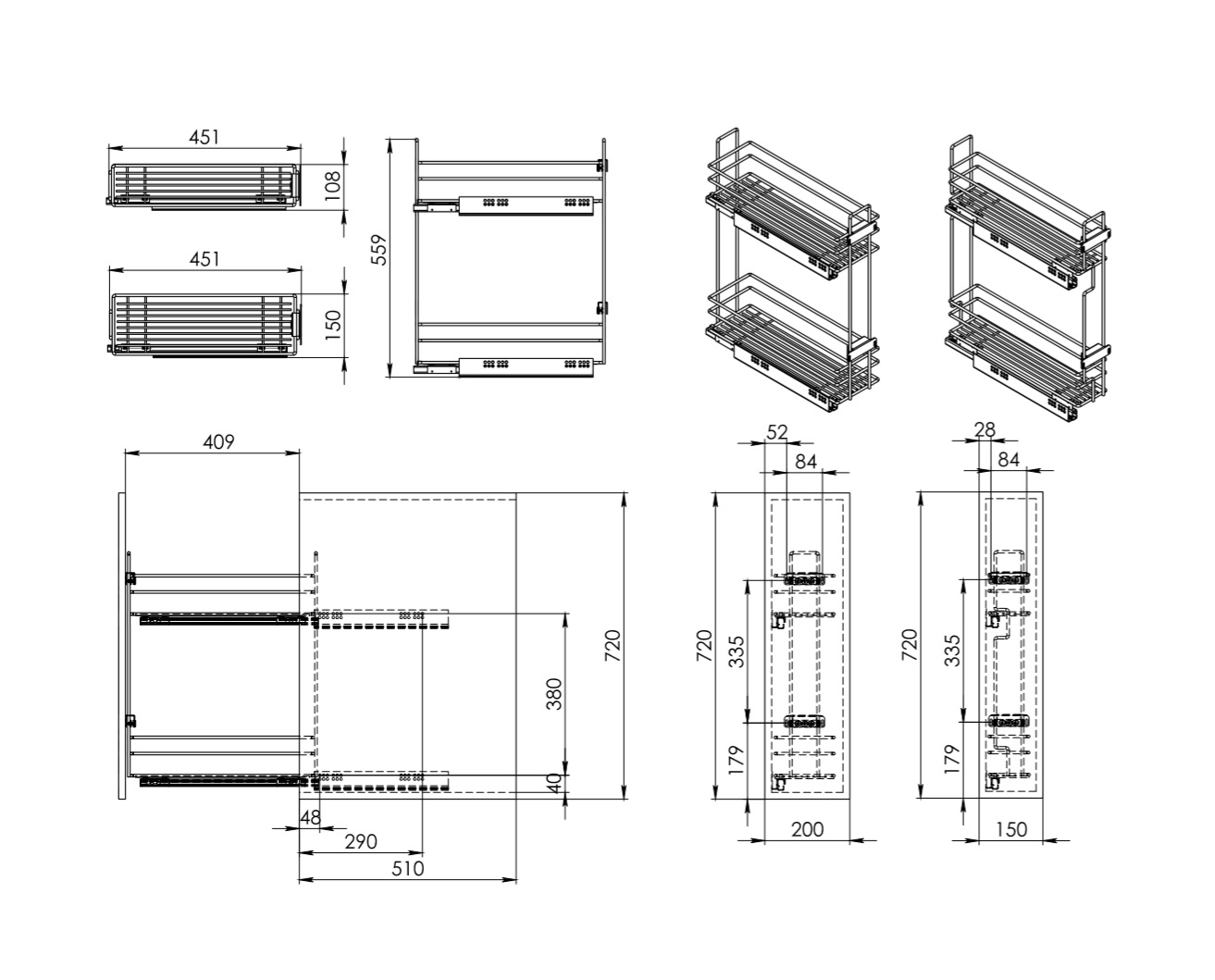 Cargo mini 150мм Квадро 1 + направл. Хеттих PUSH TO OPEN, бок.крепл. Правая, с крепл. к фасаду
