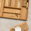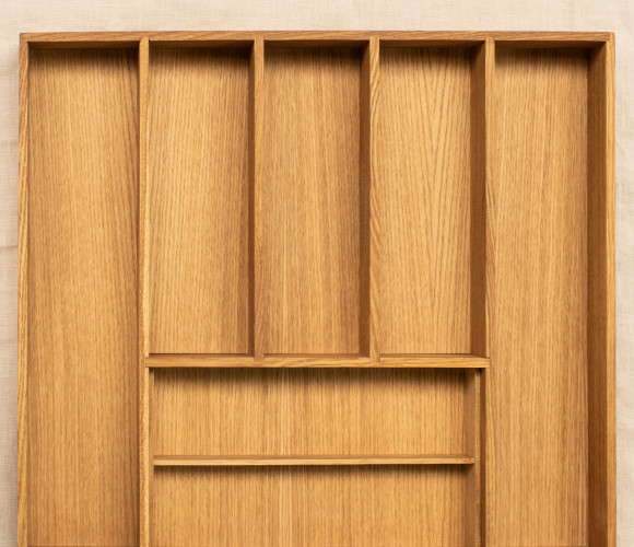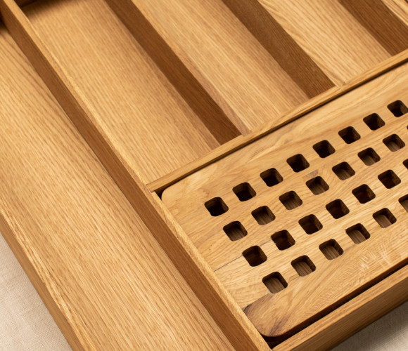 Вкладыш для столовых приборов выполнен из экологически чистого прочного дерева -дуб, материал не впитывает запахи, легко моется, не деформируется. Удобное приспособление для организации кухонного пространства. Подставка для столовых приборов вместительная и компактная, сохранит порядок и не займет много места, идеально подойдет для ящика кухонного гарнитура. Вкладыш для ножей универсальный приобретается отдельно.