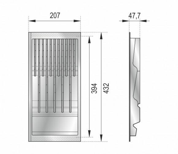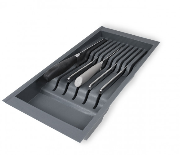 PC15 — поддон из экологичного полипропилена, необходим для хранения ножей разных габаритов. Является составным элементом для формирования индивидуальной комбинации поддонов линейки BL?KI для выдвижных мебельных ящиков глубиной 450 мм и шириной от 500 мм.