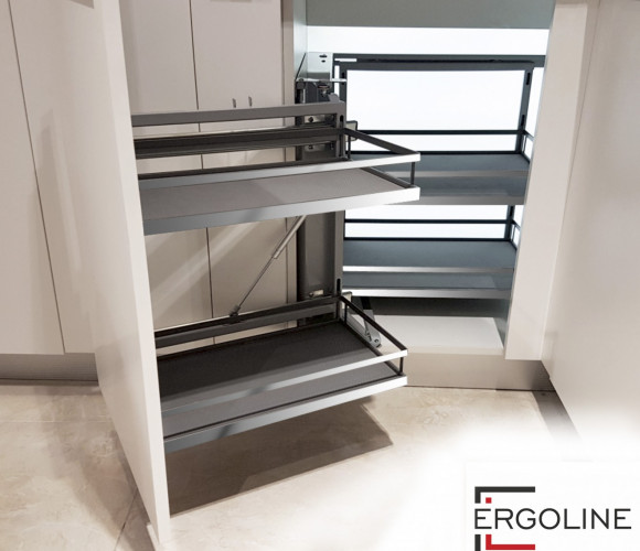 Поворотно-выкатной принцип выдвижения корзин обеспечивает легкий доступ в самые дальние уголки модуля, а два этажа корзин позволяют эргономично разместить множество предметов быта.