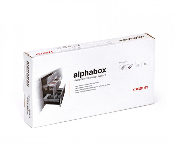 Samet Alphabox – выдвижные ящики с доводчиком, плоскими боковинами и упрощенным монтажом. Отлично сочетается со шкафами, кухнями, тумбами и другой мебелью.