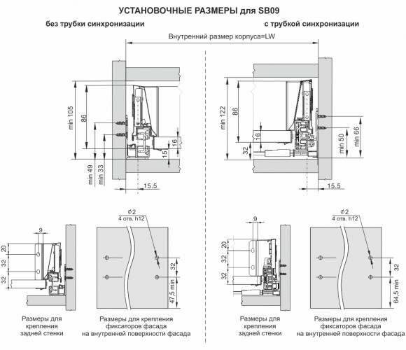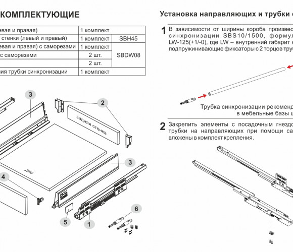 Комплект SB09 включает в себя: направляющие (левая и правая), детали для установки трубки синхронизации с крепежом, держатели задней стенки, традиционные боковые стенки, фиксаторы фасада, заглушки, крепёж.