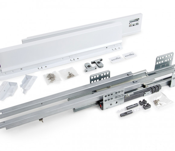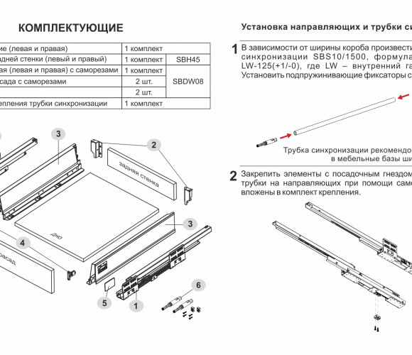 Комплект SB09 включает в себя: направляющие (левая и правая), детали для установки трубки синхронизации с крепежом, держатели задней стенки, традиционные боковые стенки, фиксаторы фасада, заглушки, крепёж.
