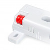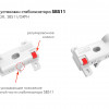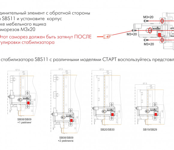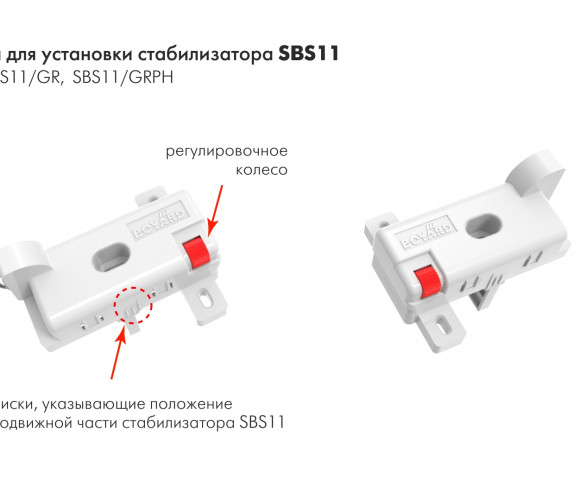 За счёт специального регулировочного колеса красного цвета осуществляется смещение конструкции SBS11 в левом или правом направлении. Прорезиненный обод направляющего колеса обеспечит бесшумную работу стабилизатора. Удобные риски на корпусе изделия позволят установить одинаковое положение стабилизаторов для максимально равномерного и синхронного выдвижения мебельного ящика.