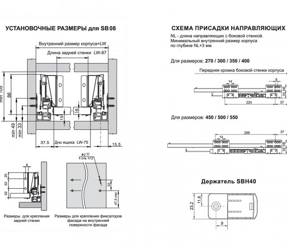 SBR09 – прямоугольный рейлинг, предназначенный для формирования выдвижных мебельных ящиков. Применяется с держателями рейлинга SBH40 и держателями задней стенки SBH61, SBH62, SBH63 (в зависимости от выбранной высоты боковин) для формирования выдвижного мебельного ящика любой желаемой высоты с прямыми боковинами в графитовом цвете.