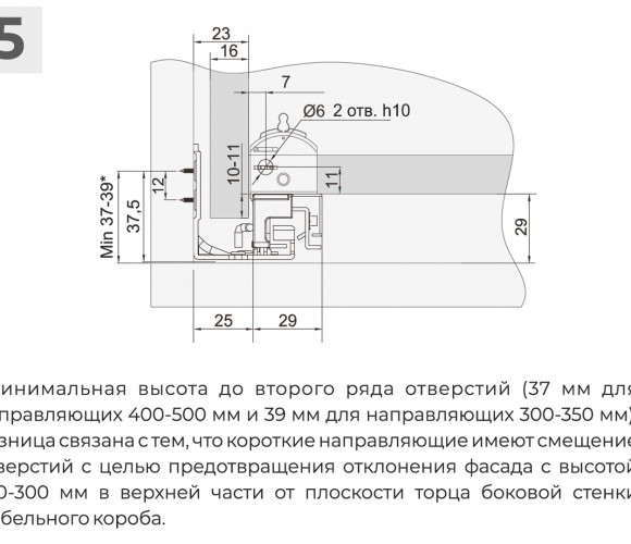Разница в монтаже коротких и больших длин заключается в значении min отступа от дна мебельного корпуса до верхнего ряда присадочных отверстий направляющей. У неглубоких моделей, до 350 мм включительно, это значение составляет min 39 мм. Установка по схеме позволяет достичь зазора в 2 мм между мебельным корпусом и направляющей. Именно корректный монтаж в соответствие со схемой позволяет избежать отклонения фасада с высотой 250-300 мм в верхней части от плоскости торца боковой стенки мебельного изделия.