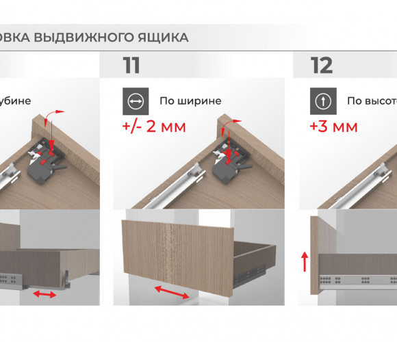 B-Slide DB9991 — направляющие скрытого монтажа полного выдвижения с 3D-регулировкой и синхронизацией. Реальная корректная и полноценная 3d-регулировка с помощью клипсы и подвижного заднего крючка позволит легко уточнить положение мебельного ящика или компенсировать возможные погрешности монтажа без применения доп. инструмента и без ухудшений параметров комфортного хода.