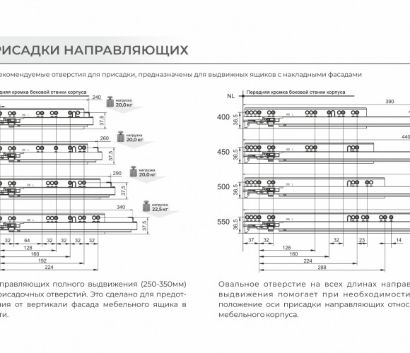 Кроме того, на всех длинах добавлено овальное отверстие, которое позволяет, при необходимости, дополнительно отрегулировать оси присадки направляющих относительно боковины мебель¬ного корпуса.