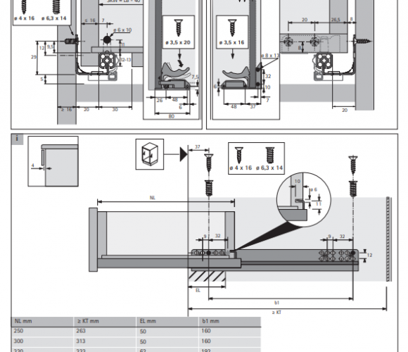 При использовании держателя для фиксации полки в выдвинутом положении длину ящика необходимо уменьшить на 12 мм. (NL) (NL - 12 мм)