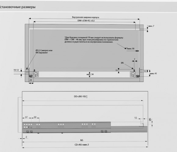 Возможность установки ящика с толщиной боковин толщиной до 19 мм