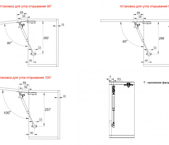 Газовый лифт поставляется в комплекте с шаблоном-инструкцией для установки, которая поможет легко и быстро произвести монтаж, а также и выбрать угол открывания фасада 80°, 90° или 100°.