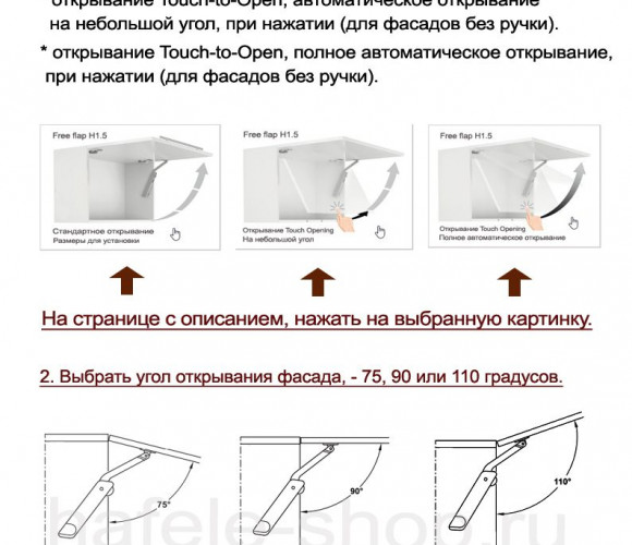 - Схемы установки с открытием фасада на 75, 90 и 110 градусов.