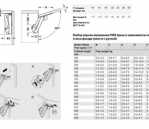 Выбор подъемного механизма Free Space 1.11 по нагрузочной способности зависит от высоты корпуса и веса фасада, включая лицевую фурнитуру.