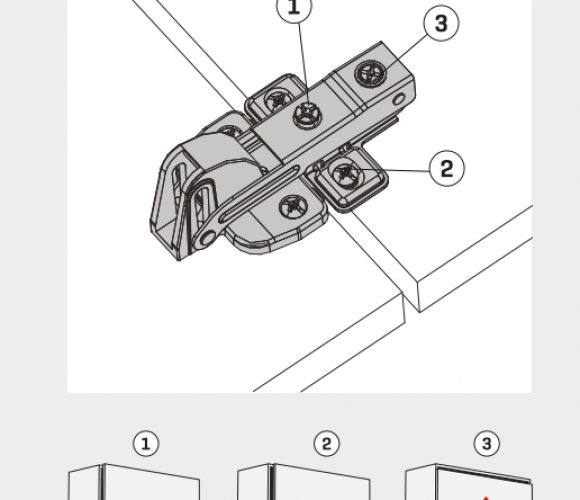 - Регулировка верхнего фасада: по высоте (+/-2 мм) – по ширине (+/-2 мм) – по глубине (+/-2 мм)