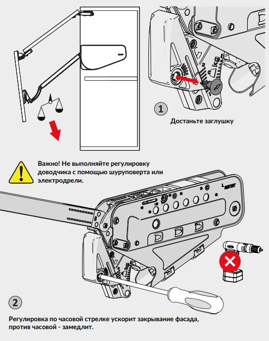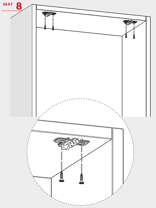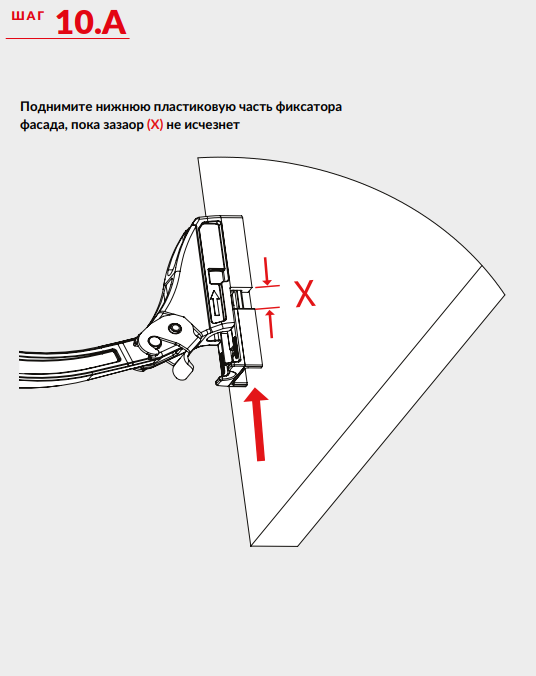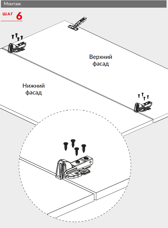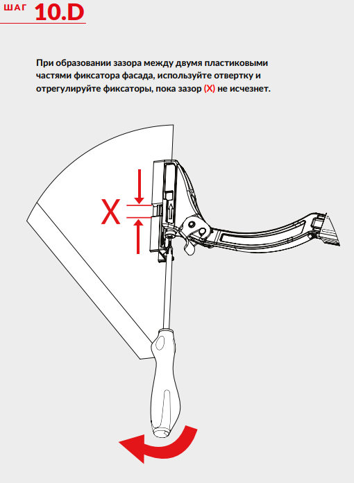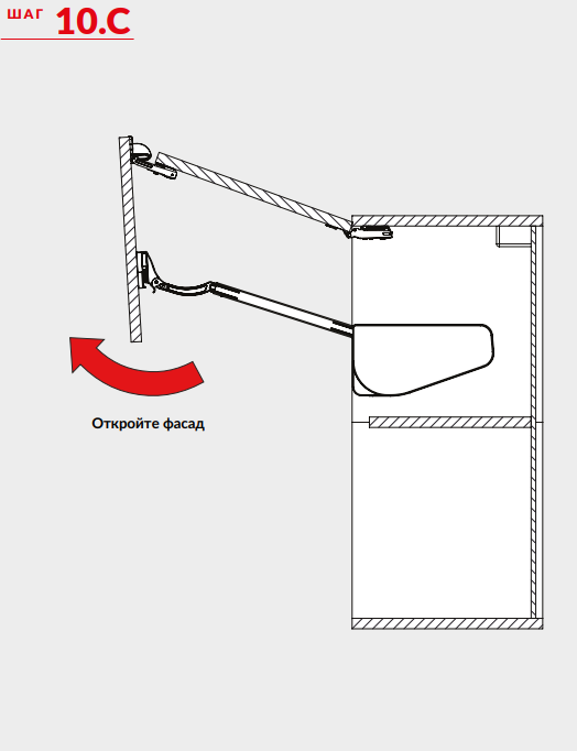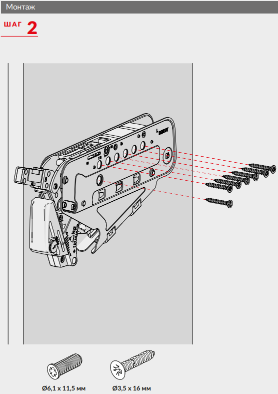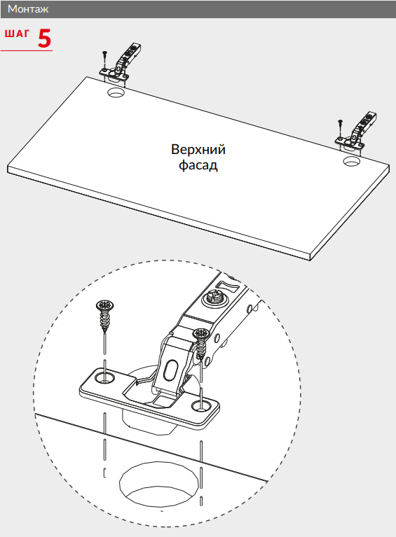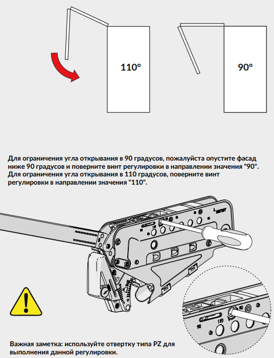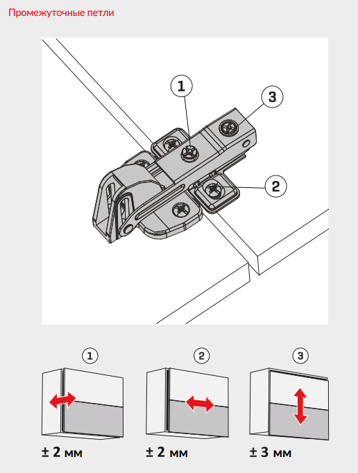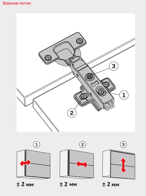 - Регулировка верхнего фасада:  по высоте (+/-2 мм) – по ширине (+/-2 мм) – по глубине (+/-2 мм)