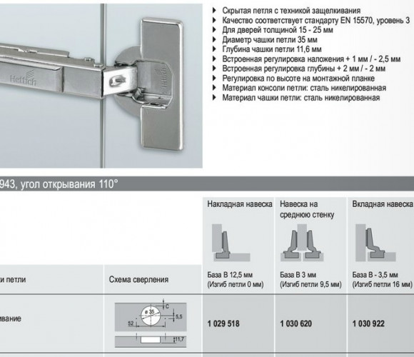 - Скрытая петля с техникой защелкивания с функцией самозакрывания