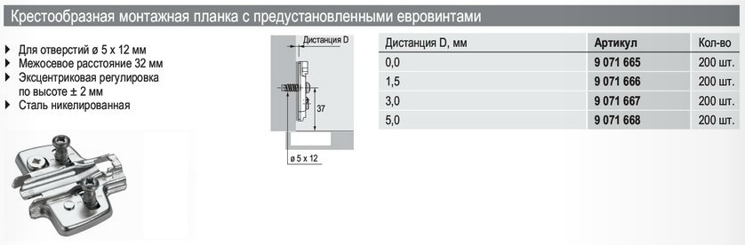 907166801 Крестообразная монтажная планка для петли Sensys, дистанция 5, с евровинтами, с эксцентр.