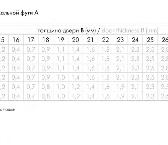 Для подбора подходящей планки в первую очередь необходимо определить минимальное значение фуги А по таблице «Расчёт минимальной фуги», затем высчитать наложение фасада и далее подобрать ответную планку с помощью таблицы подбора планок. Для фасадов увеличенной толщины — более 22 мм — рекомендуется с особым вниманием отнестись к данному расчёту.