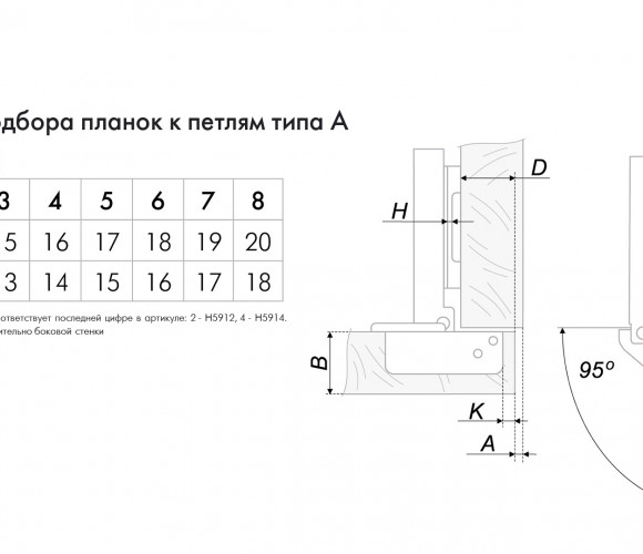 Как и другие представители линейки NEO модель Н319 является конструктором: ответные планки к петле подбираются исходя из индивидуальных монтажных значений. Для Н319 созданы две монтажные планки разной высоты — Н5912 и Н5914. Они индивидуальны для петли EXTRA Н319 и не подходят к другим моделям линейки NEO. Монтажные планки Н5912 и Н5914 приобретаются отдельно исходя из толщины фасада и боковины корпуса, значения «К» (расстояние до чашки) и ряда других параметров, которые высчитываются по формулам для петель типа А, В и С (формулы размещены в карточке товара).