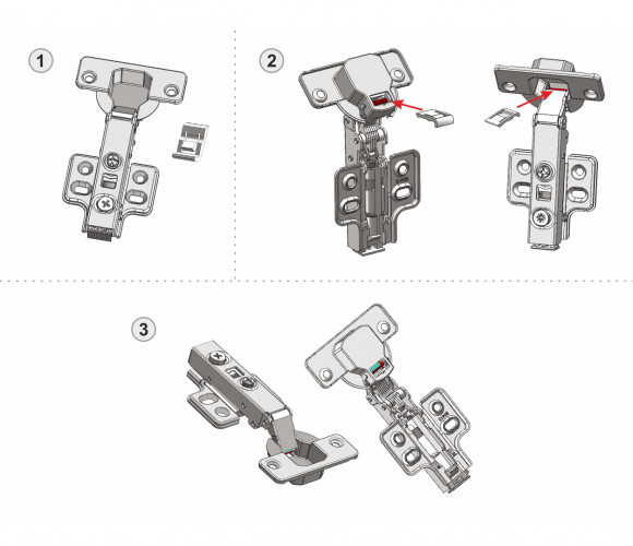 LIMIT H87 размещается через специальный паз как с обратной стороны (для петель H89002, H845, H801 (A|B|C), H813, H741, H742, H641, H642, H305 (A|B|C), H306 (A|B|C), H301 (A|B|C)), так и с лицевой стороны (для петель H319 (A|B|C)) чашки петли: на верхнюю ось скобы между седлом и серьгой. При необходимости аксессуар можно демонтировать.