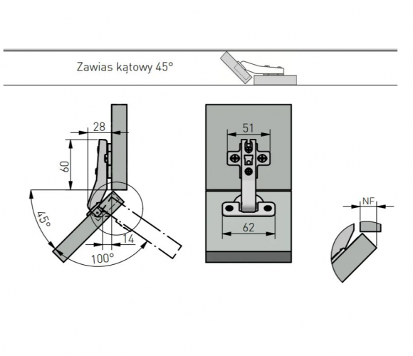 Петля 45° применяется в угловых шкафах, где фасад в закрытом положении находится под соответствующим углом к боковине шкафа.