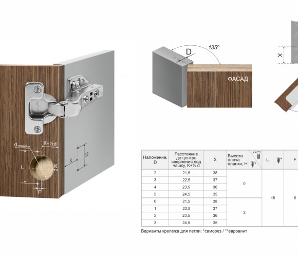 Модель можно укомплектовать разными видами планок: трапециевидной формы, с высотой 0 или 2 мм, с вкрученными евровинтами или с креплением на саморезы, а также декоративными заглушками на чашку и на тело петли и ограничителем угла открывания LIMIT H87. Планки и аксессуары приобретаются отдельно.