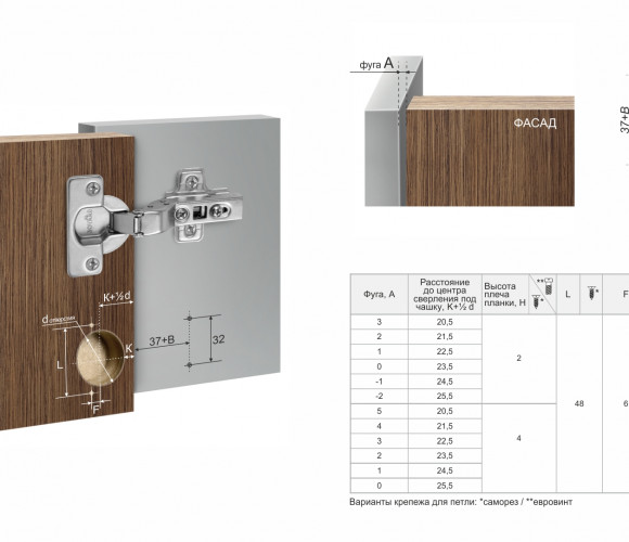 Как и другие представители линейки NEO модель Н319 является конструктором: ответные планки к петле подбираются исходя из индивидуальных монтажных значений. Для Н319 созданы две монтажные планки разной высоты — Н5912 и Н5914. Они индивидуальны для петли EXTRA Н319 и не подходят к другим моделям линейки NEO. Монтажные планки Н5912 и Н5914 приобретаются отдельно исходя из толщины фасада и боковины корпуса, значения «К» (расстояние до чашки) и ряда других параметров, которые высчитываются по формулам для петель типа А, В и С (формулы размещены в карточке товара).