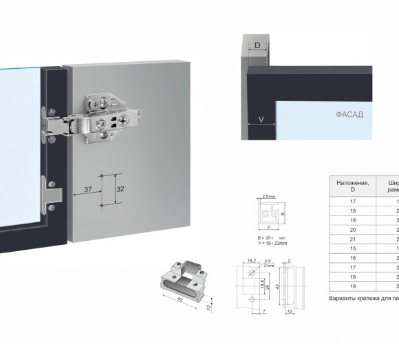 Модель можно укомплектовать разными видами планок: трапециевидной формы, с высотой 0 или 2 мм, с вкрученными евровинтами или с креплением на саморезы, а также декоративной заглушкой на тело петли. Планки и аксессуары приобретаются отдельно.
