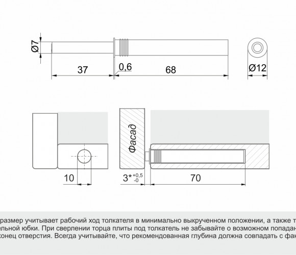 Толкатель AMF14/GR – классический компаньон мебели без ручек, он предназначен для распашных фасадов на петлях с пружиной. Способен выталкивать даже тяжелые и крупные фасады на 37 мм. Обладает регулировкой расстояния зазора между наконечником толкателя и фасадом в закрытом положении +5 мм.