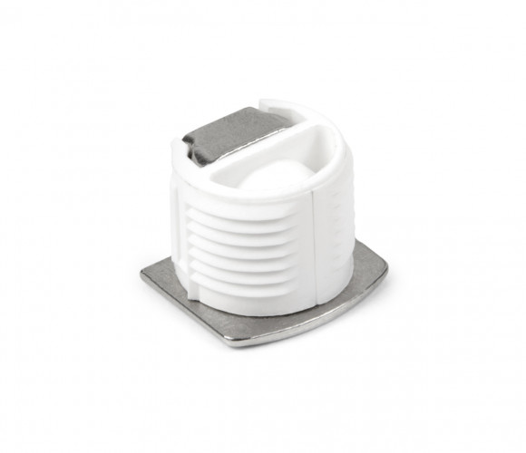 Рёбра по окружности пластикового корпуса служат для плотной фиксации держателя в полке, особая конструкция полкодержателя прочно закрепляет полку на фланце, а разборное соединение удобно для пробной сборки, хранения и перевозки мебели.