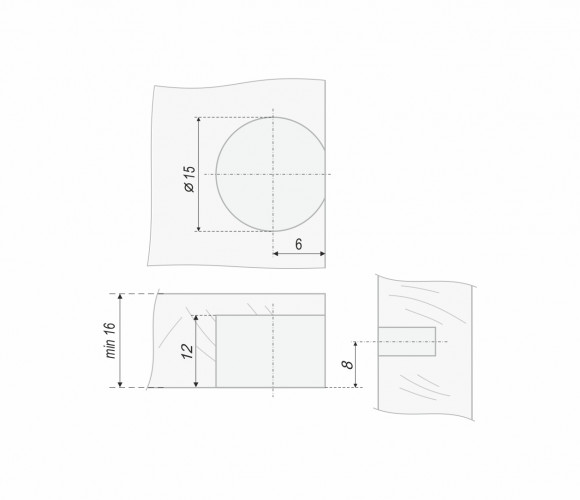 Для монтажа полки необходимо в плитном материале подготовить отверстие 15х12 мм, установить пластиковый корпус полкодержателя, прикрепить металлический фланец к боковой стенке мебели на саморез или евровинт MT03/06/6,3*11Cr/0 и надеть полку на фланцы.