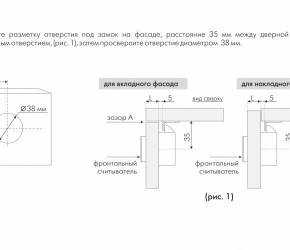 Замок Z604 легок в установке. Фронтальный считыватель врезной, а ответная часть замка монтируется с обратной стороны фасада накладным способом. Подходит для фасадов с ручками и для PUSH, для распашных и для выдвижных фасадов.